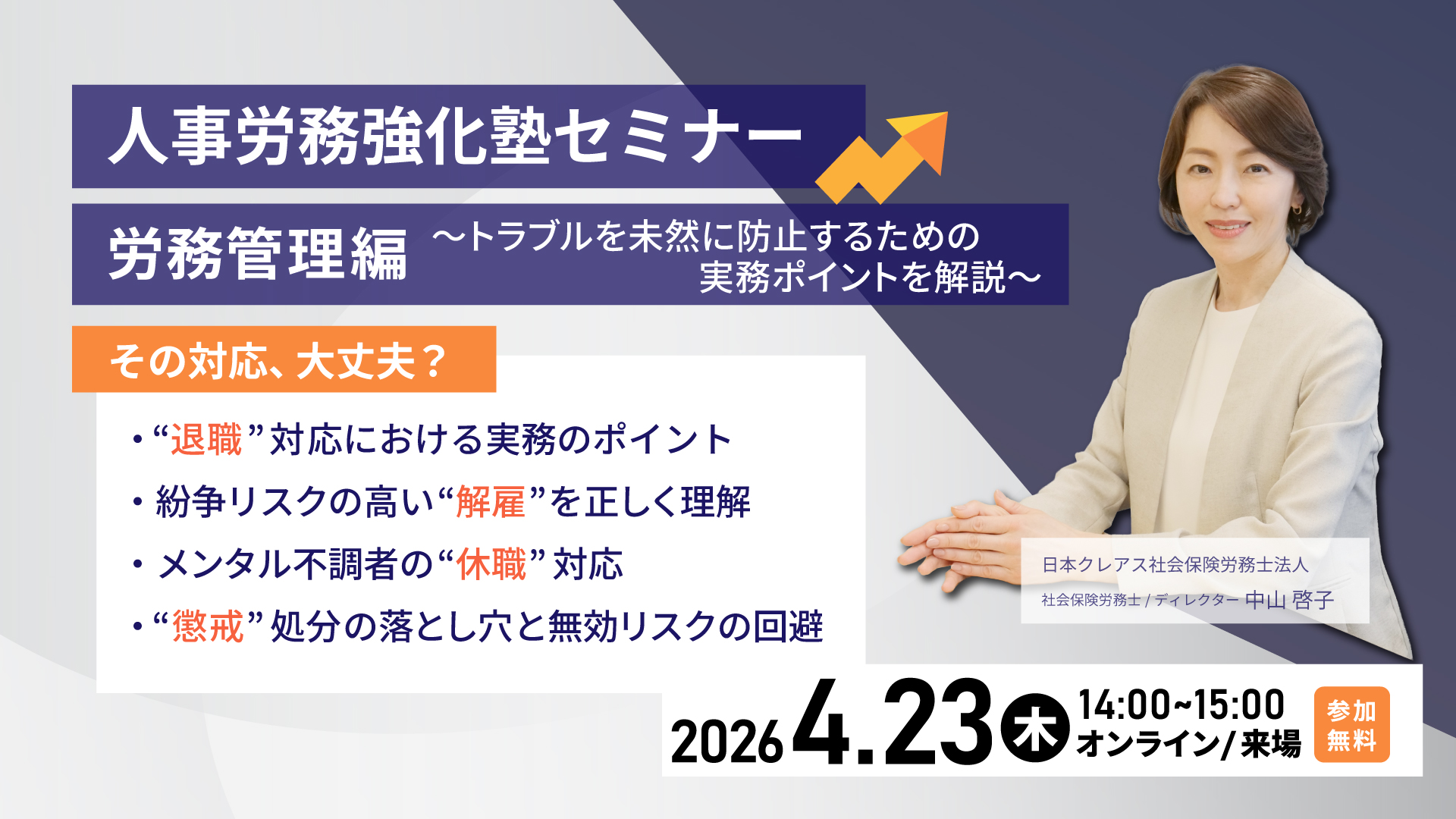 本セミナーでは、労務トラブルが起きやすい4大テーマについて、改めて正しい知識、対応をお伝えします。